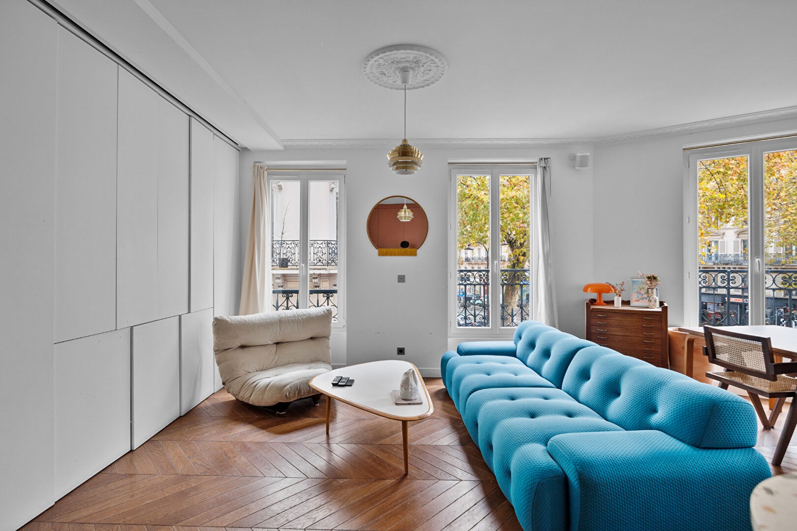 L'entrée dessert un séjour d'angle spacieux et baigné de lumière, sublimé par le charme de l'ancien : parquet, moulures et cheminée.