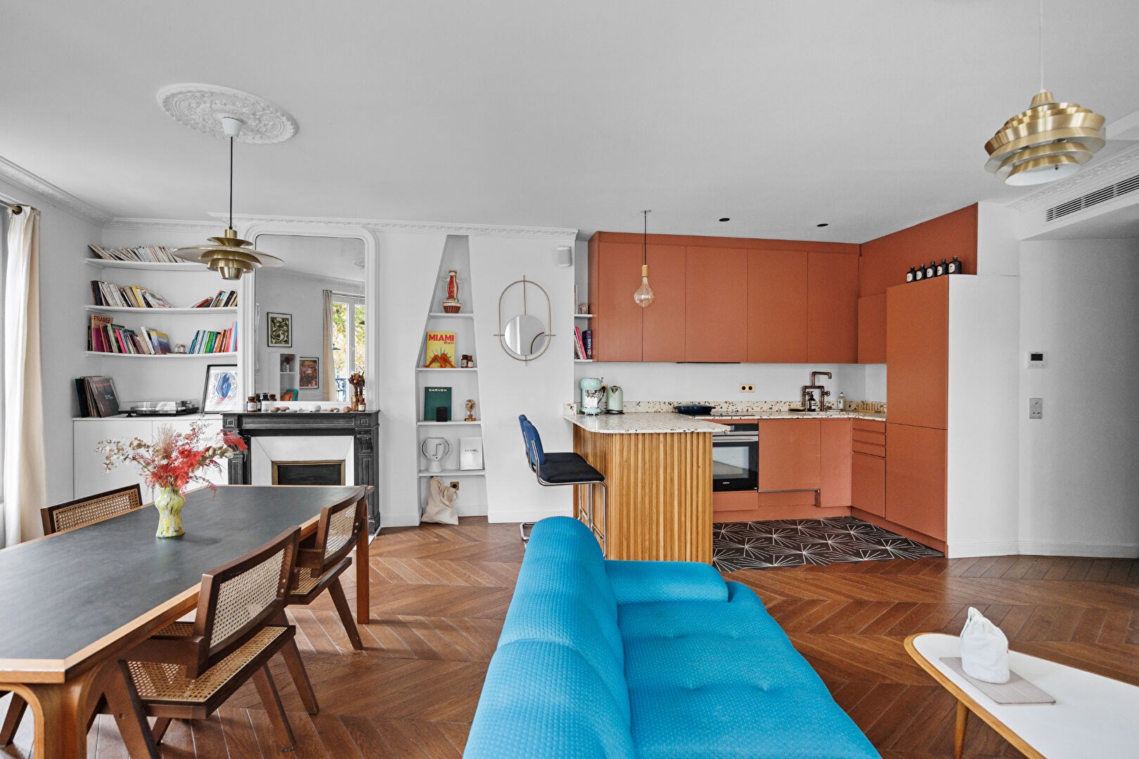 La cuisine ouverte, élégamment intégrée, s'inscrit naturellement dans l'espace de réception.
