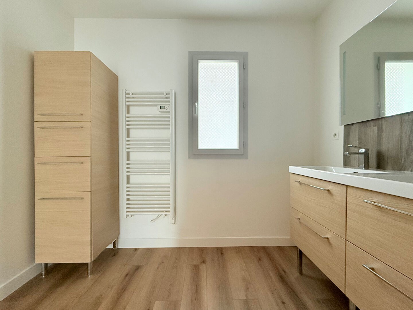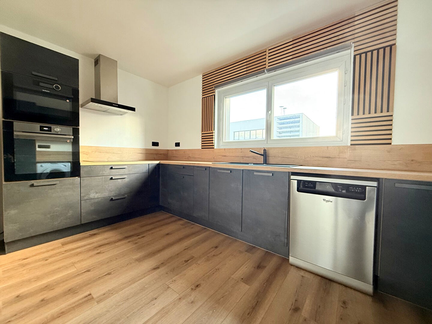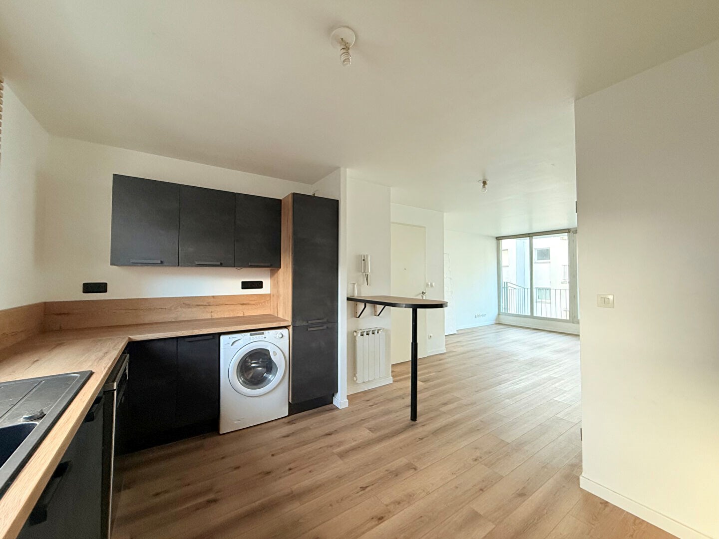 Au rez-de-chaussée, l'appartement s'ouvre sur une entrée menant à un séjour lumineux, agrémenté de grandes baies vitrées donnant accès à un balcon. La cuisine, aménagée et entièrement équipée, est ouverte sur le séjour, offrant un espace moderne et convivial. Un placard de rangement complète cet étage.