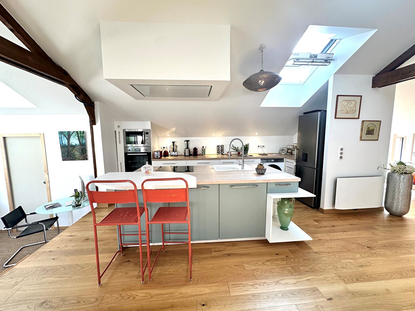 Découvrez des volumes impressionnants : belles hauteurs sous plafond, poutres apparentes, grandes ouvertures façon jardin d'hiver qui baignent l'espace de lumière.