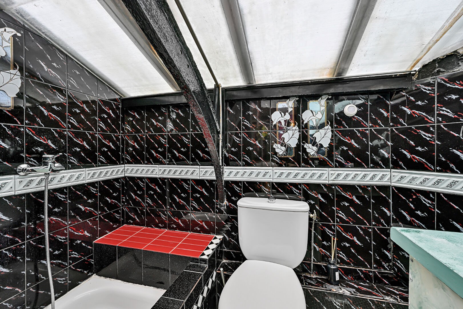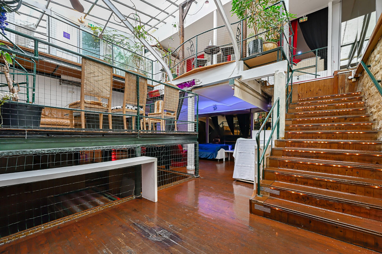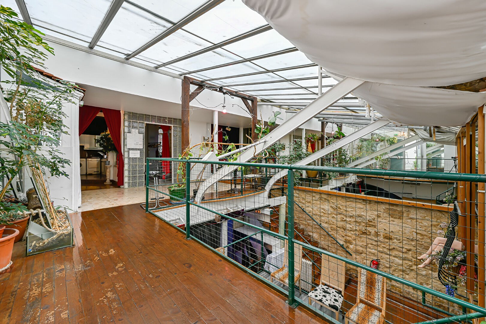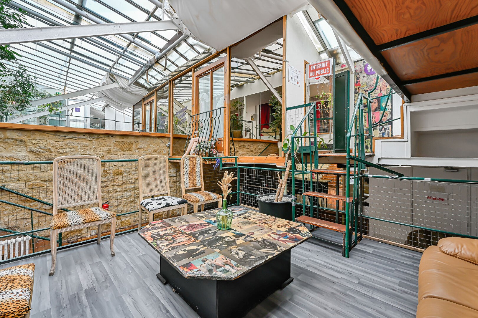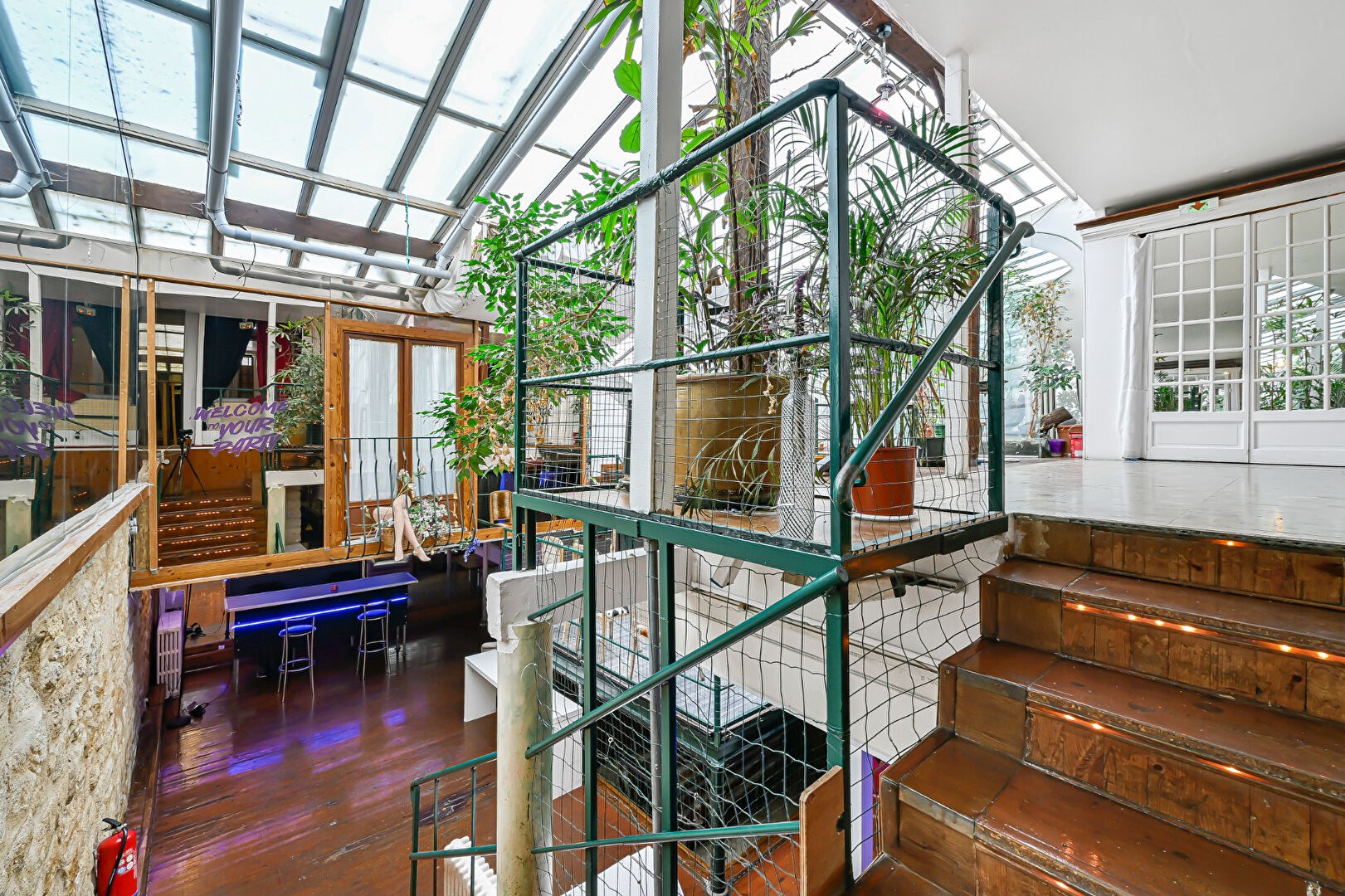 La pièce maîtresse du lieu : une verrière toit cathédrale culminant à près de 10 mètres de hauteur, soutenue par une structure métallique type Eiffel, offrant lumière naturelle et cachet brut.
