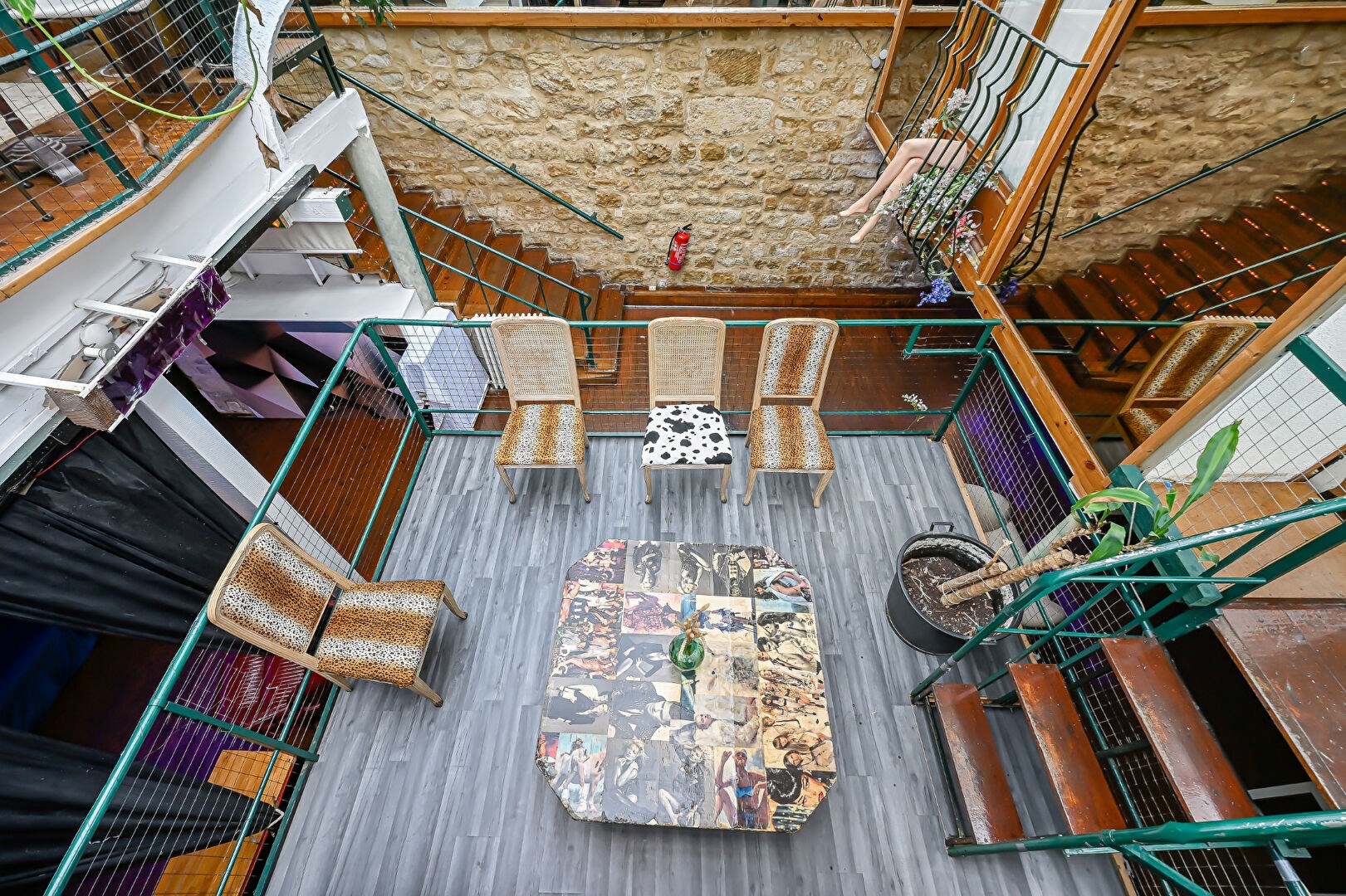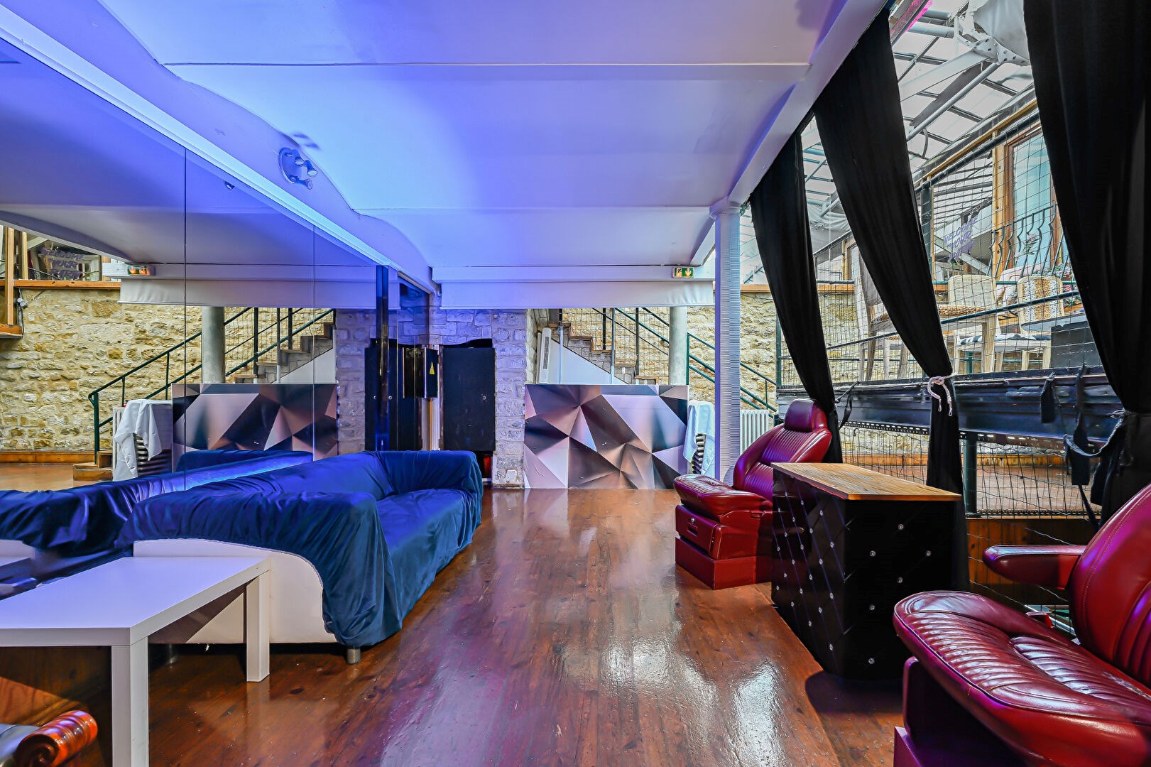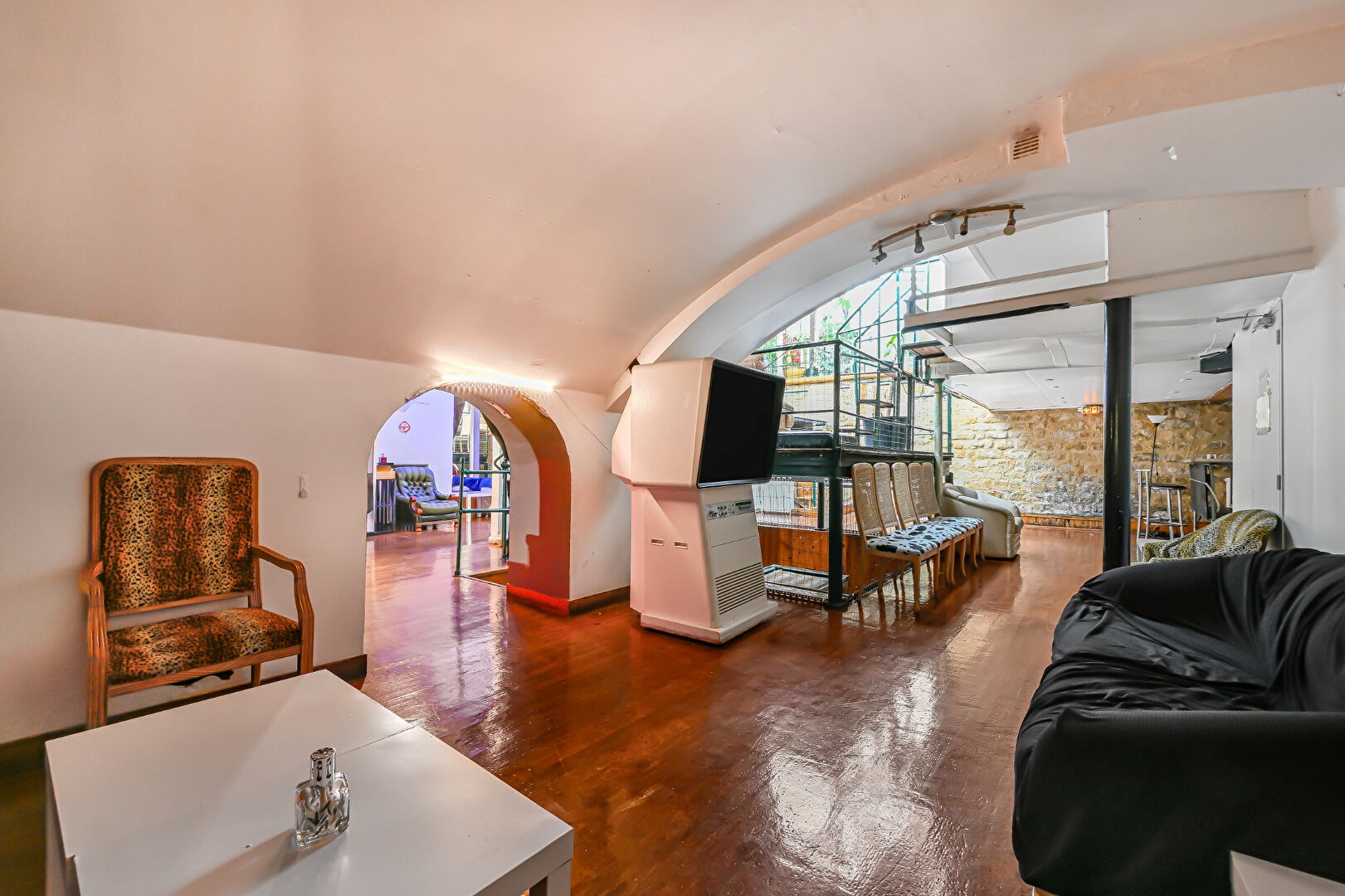 Le rez-de-chaussée propose une cuisine séparée, un bureau, une salle de bains avec WC et un espace détente. Le niveau inférieur, un souplex spacieux et modulable, comprend plusieurs espaces autour d'une estrade centrale et mis en valeur par des voûtes et des murs en pierre, idéales pour événements, showrooms, tournages ou activités libérales.