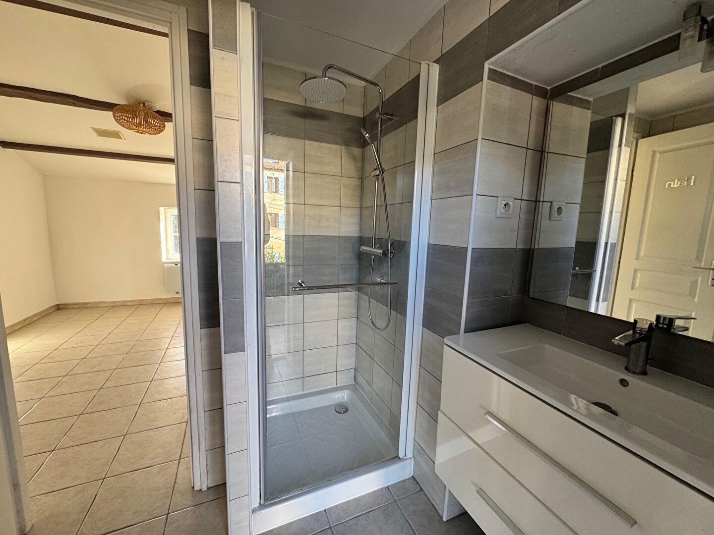 A l'étage : une chambre, une salle de douches, avec WC de 15m². Accès balcon surplombant le patio