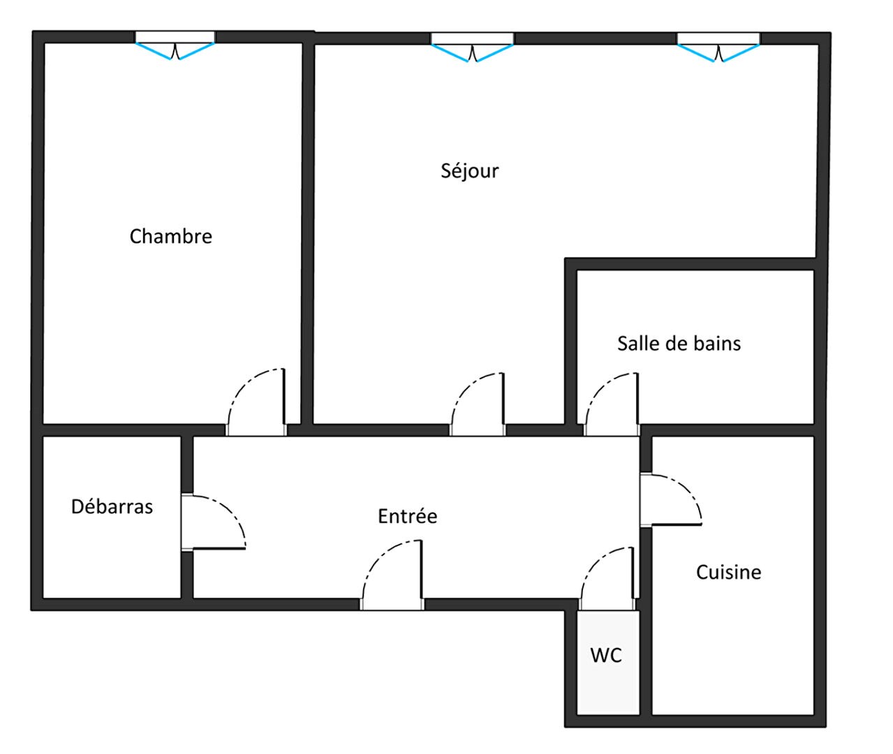 Appartement traversant comprenant une entrée avec placard, un séjour exposé ouest avec vue dégagée, une chambre, une cuisine indépendante sur cour, une salle de bains, et un WC indépendant.