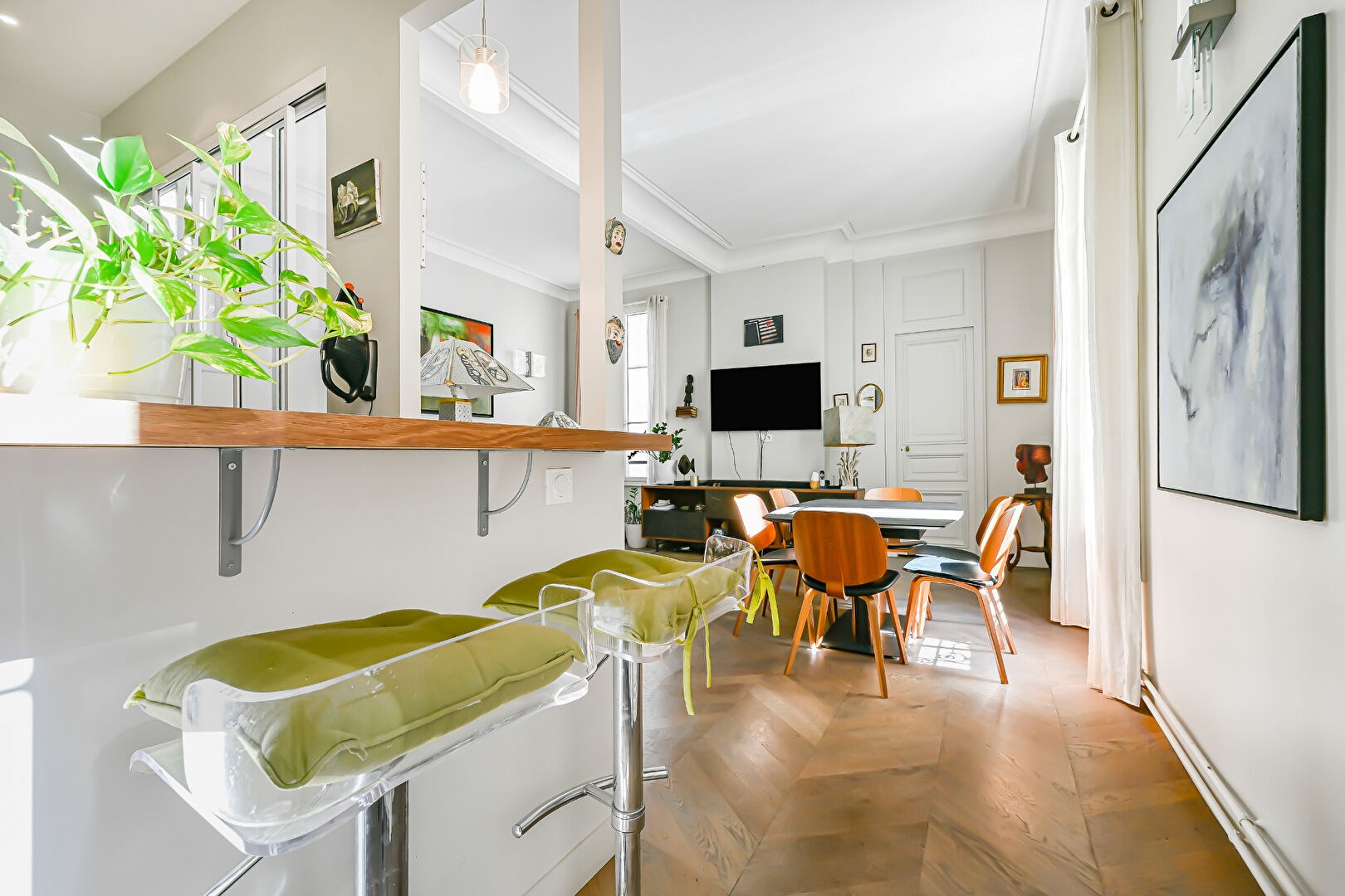 Parquet point de Hongrie, 3,30 mètres de hauteur sous plafond. Charme de l'ancien (moulures, cheminée). Nombreux Placards Dressing sur mesure dans chaque chambre
