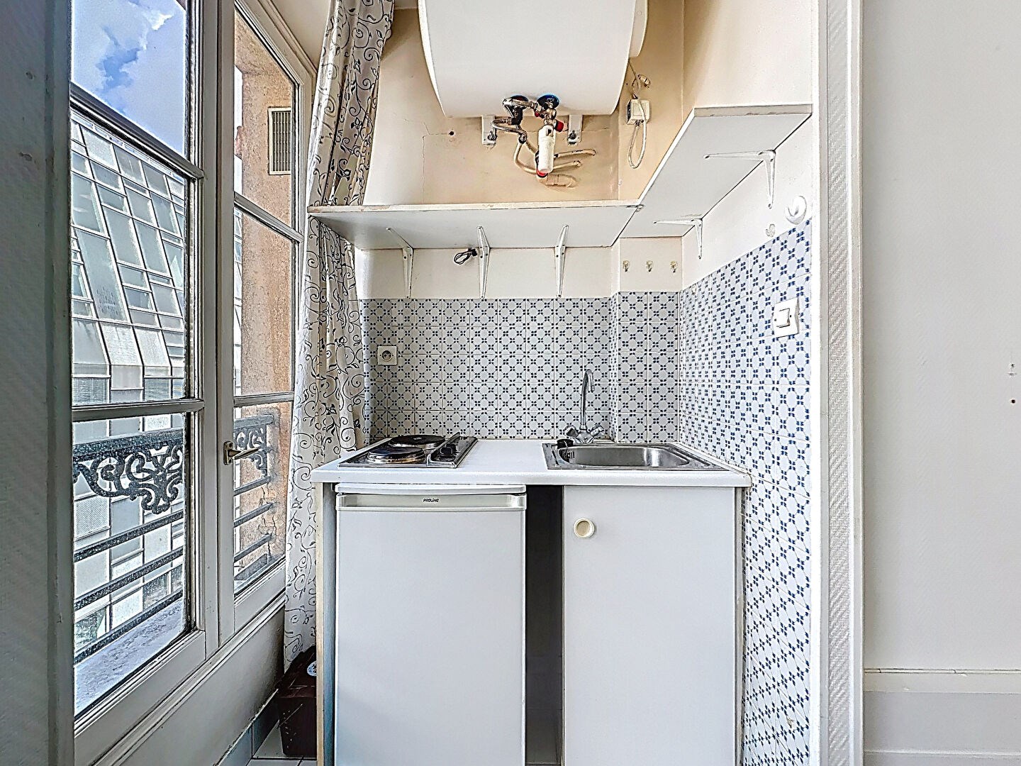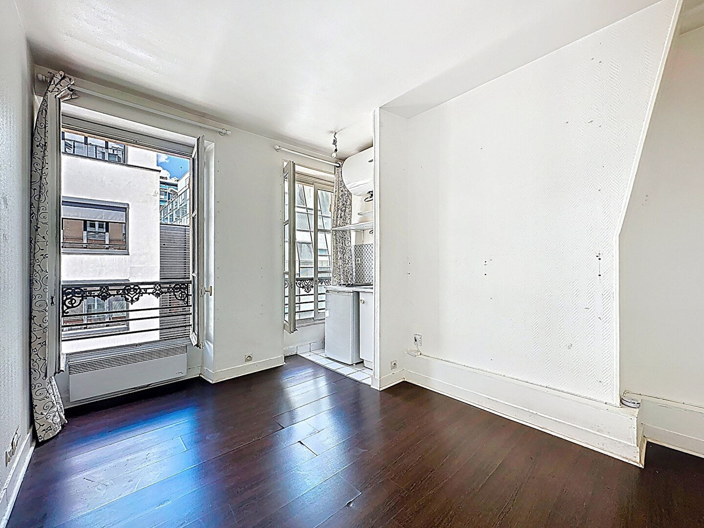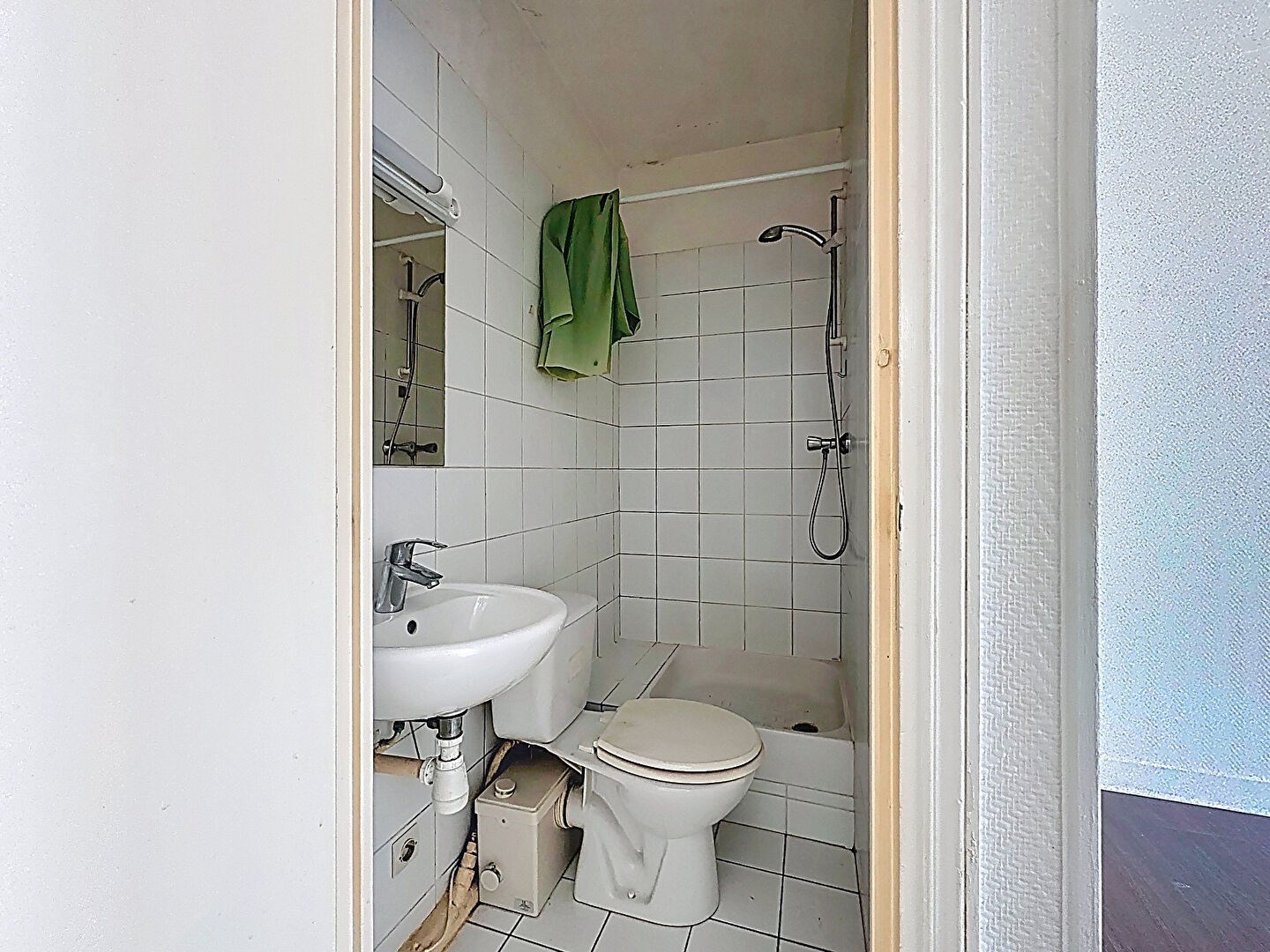 D'une surface de 13,69 m², il se compose d'une entrée, d'un séjour bénéficiant de deux fenêtres exposées Ouest, d'un coin cuisine, ainsi que d'une salle d'eau avec WC (sanibroyeur). L'appartement est entièrement à rénover et offre un beau potentiel d'aménagement.