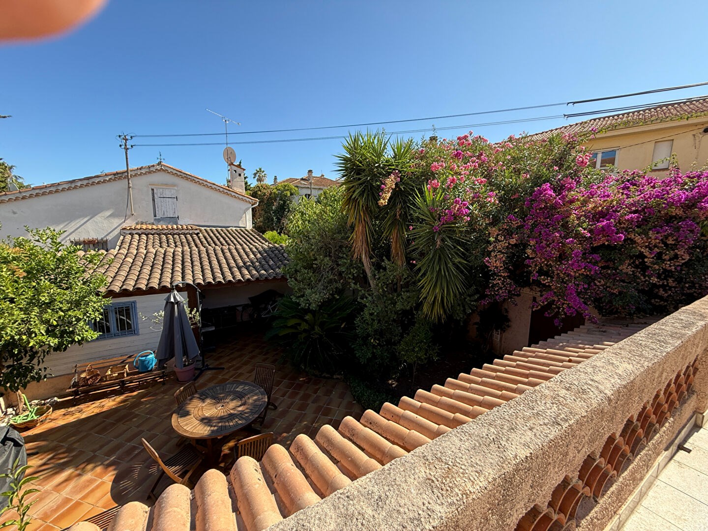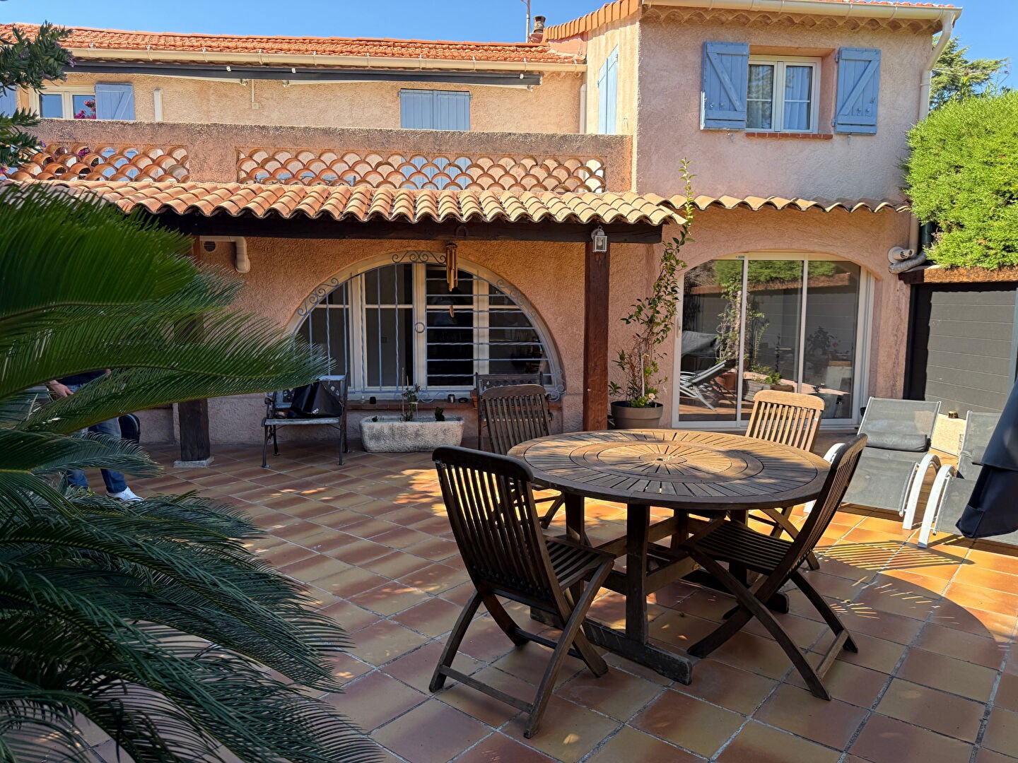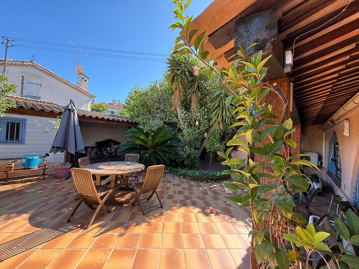 Au pied de la maison, une terrasse de 100m² arborée et aménagée comme un patio espagnol vous donnera la possibilité de recevoir vos convives dans une atmosphère paisible.