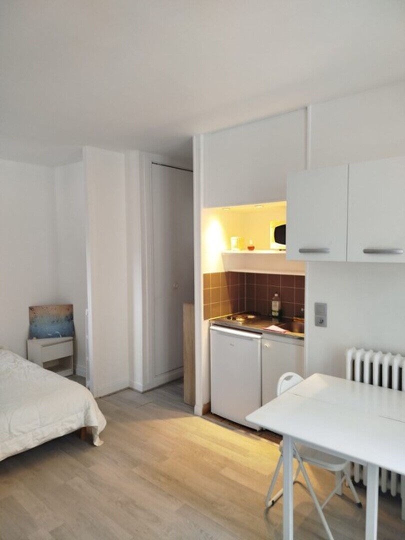 Il se compose d'une entrée avec rangements, d'une salle de bain avec WC, et d'une pièce principale lumineuse avec coin kitchenette entièrement équipée. Le logement est loué meublé, prêt à emménager.