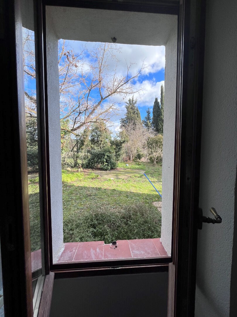 La vue donne sur le jardin et sur la terrasse qui est dédiée à l'appartement.